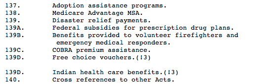 So, while Congress debates whether to raise the debt limit or cause catastrophic damage to the country's economy, we diligently worked on making further improvements in the way we display tax law on tax26.com. And one of the items that is causing our parsing engine to choke, is Section 139D of the Tax Code. Search for it on any site you like: (26 U.S.C. 139D). (Thanks to Sergey, author of the parsing engine, for pointing this out!)